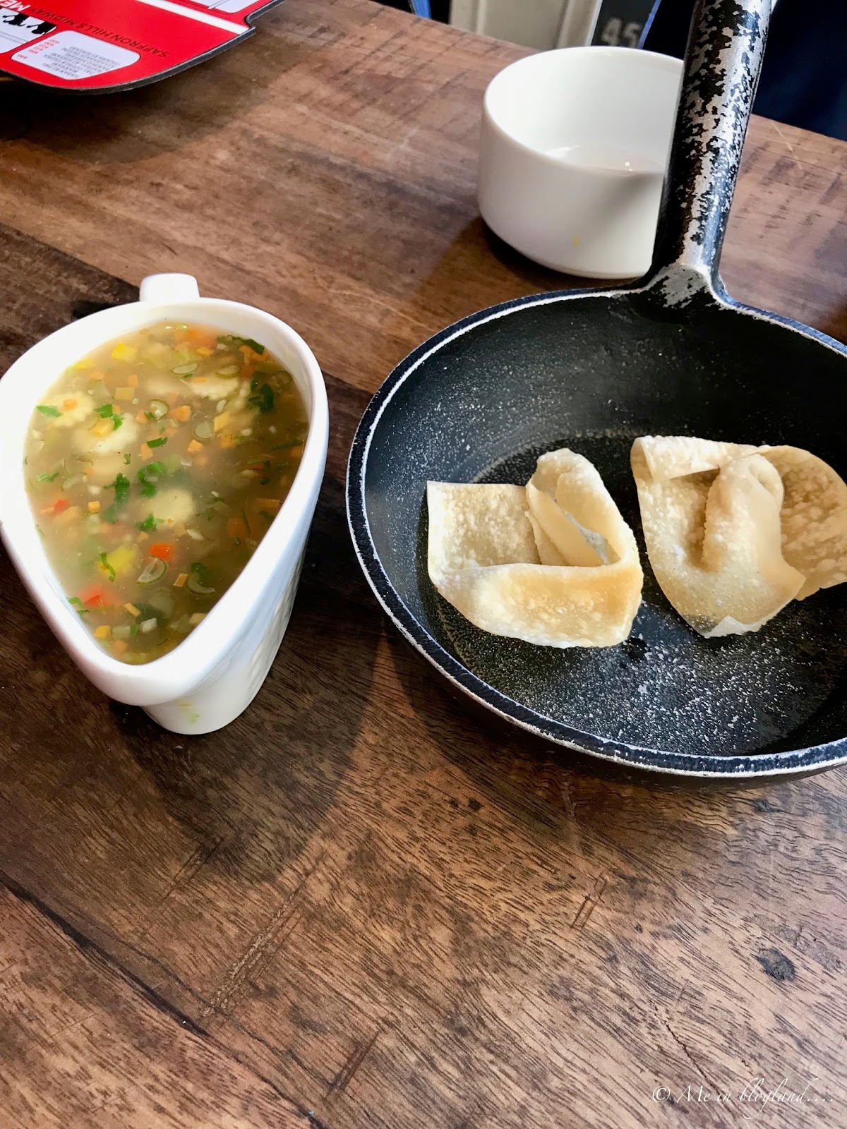 We ordered this soup for the kids thinking the description sounded quite mellow. We were wrong! The soup was tangy and spicy with a colorful assortment of vegetables and herbs in it which would have been too much for my little ones even when they weren't feeling a bit under the weather. It was served along with two crispy wontons which they did try though. I ended up finishing the soup and with it being hearty and tasty, I did quite enjoy it.