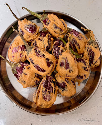 When preparing Badanekayi Ennegayi at home, my preferred pairing is with ukkarisida akki rotti, although it also goes well with rotis, chapatis or Malabar parotta. Jolada rotti is something I am yet to learn but I know that I'll get there some day.
