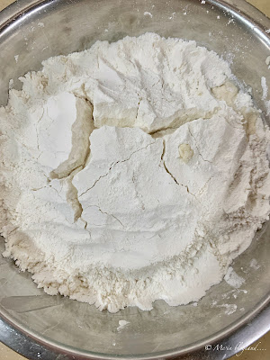1. Add the bread flour to a large mixing bowl. Make a well in the centre, add the sugar, yeast and half the quantity of lukewarm water. Mix within the area of the well and cover it up with the rest of the flour and pat down. Keep aside uncovered for 20-25 min.